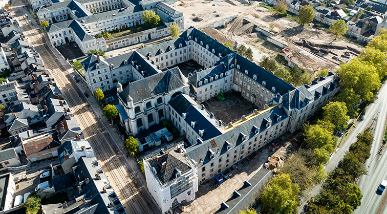 Bâti sur le site historique de l’ancien Hôpital-Madeleine dans le centre-ville d’Orléans, le campus de 18 000 m2 s’inscrit dans une démarche écologique forte, privilégiant les espaces végétalisés, panneaux photovoltaïques, parking à vélos et proximité directe avec les transports en commun.